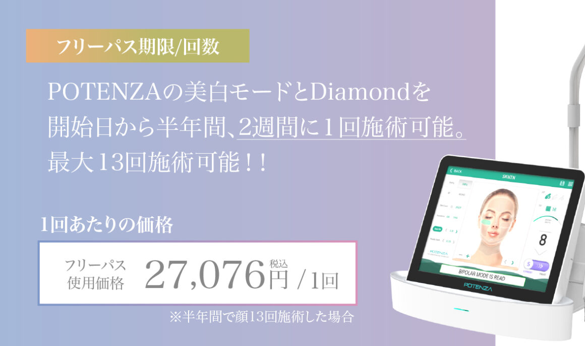 (施術間隔が必要の為、2週間に1回Diamondチップ7回、美白モード6回の最大13回施術可能)