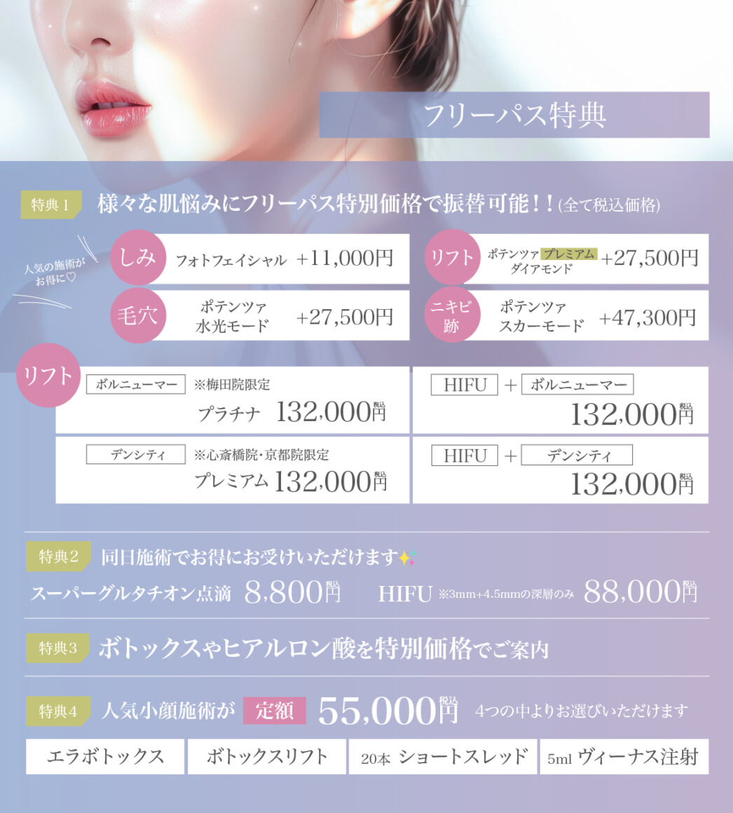 • POTENZAダイアモンド:77,000円、エラ+側頭筋+首ボトックス:171,600円、顎ボトックス:44,000円、顎ヒアルロン酸1ml:110,000円