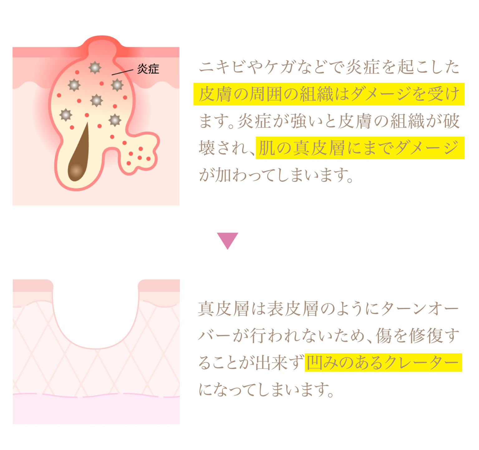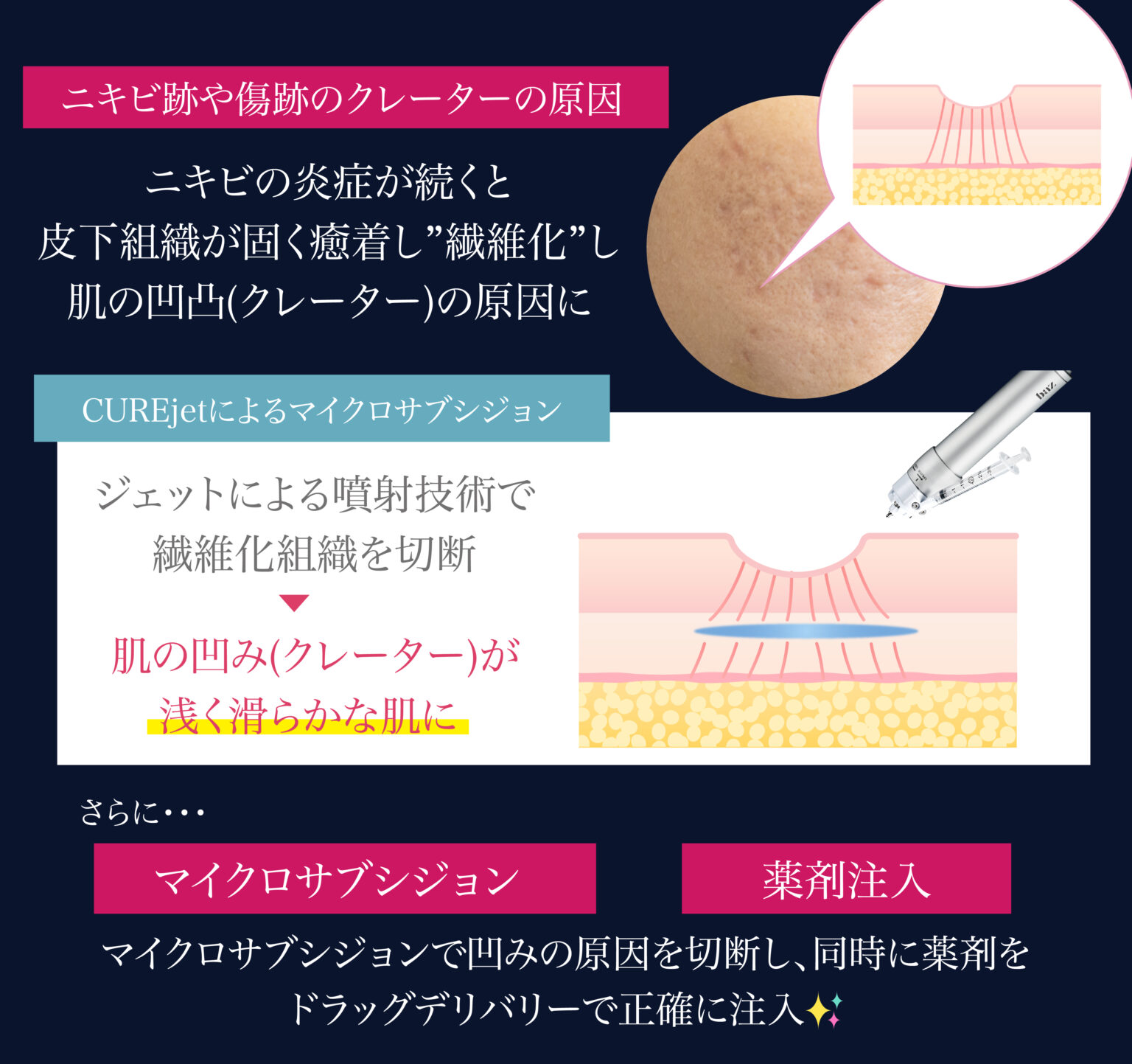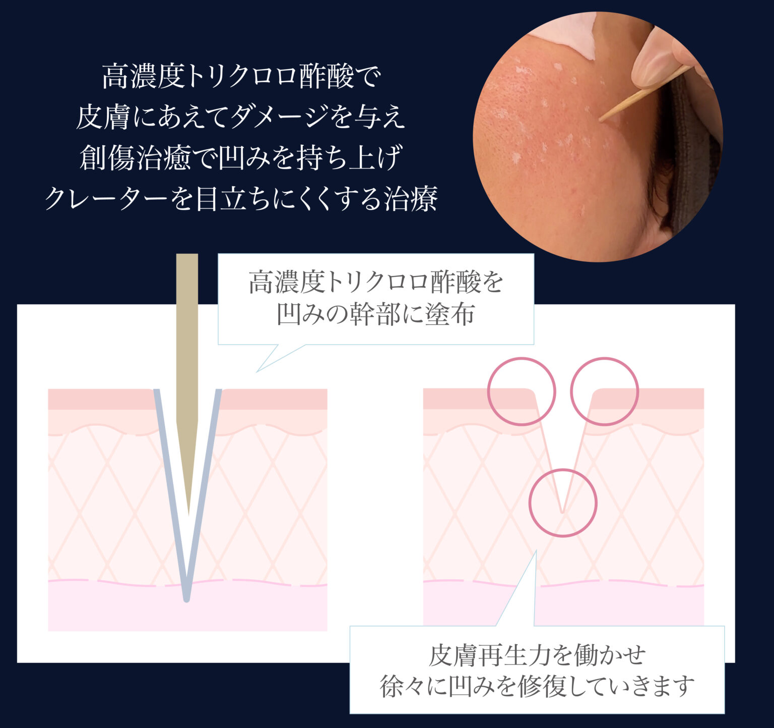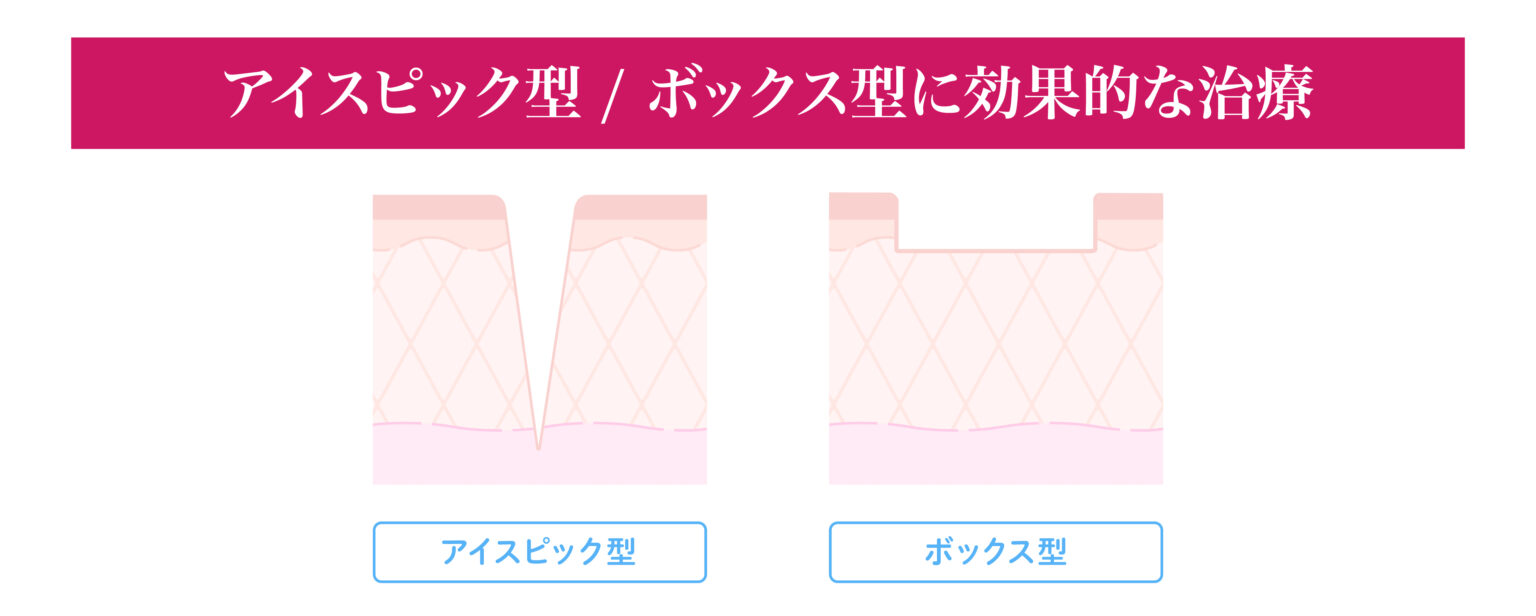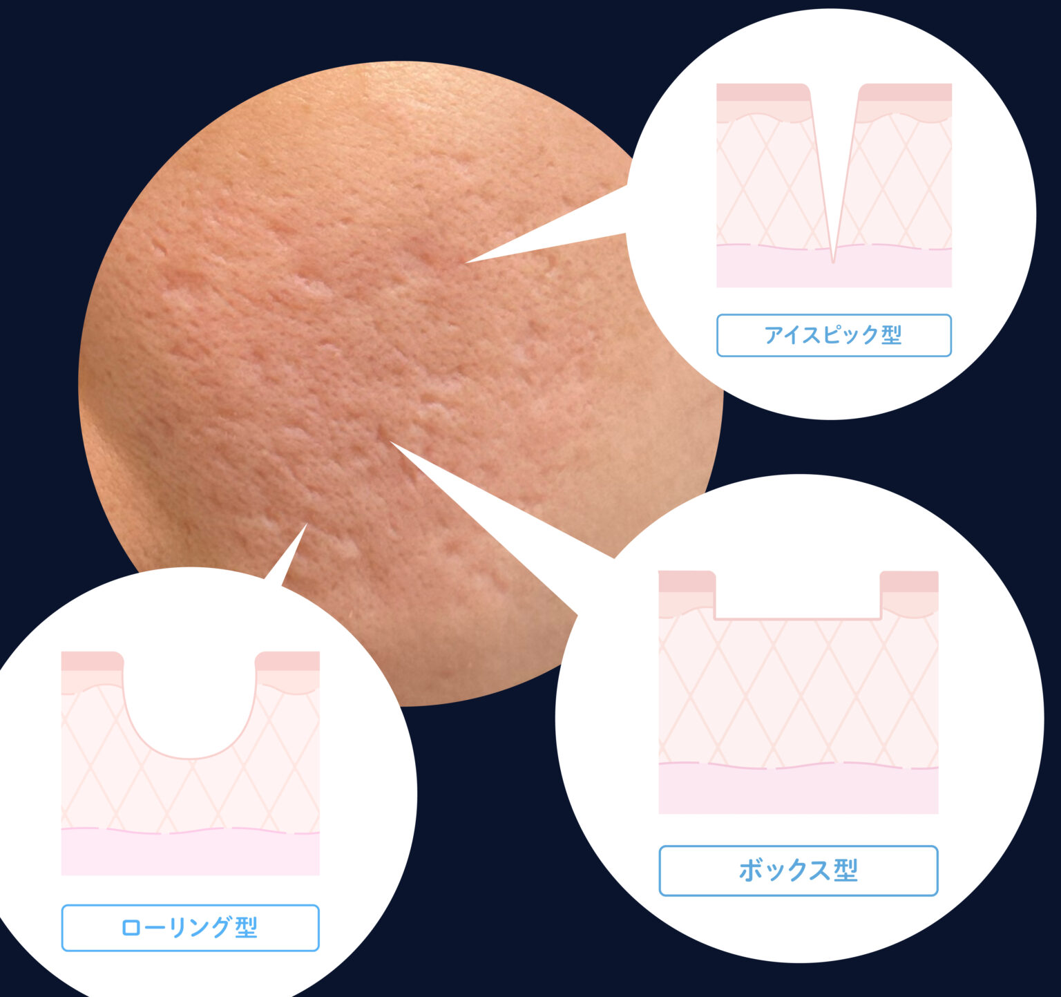 ニキビ跡の中で最も治療に難渋するのがクレーターです。クレーターは形や深さから、アイスピック型・ボックス型・ローリング型に分類されます。これらのクレーターを治療するにはそれぞれに合わせた治療を行うことが必要です。