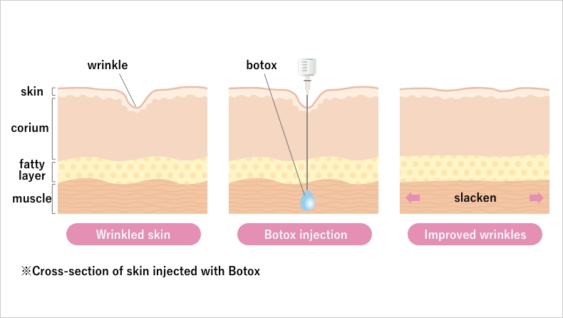 Relieves muscle contraction, deep expression lines, small face, and other problemsBotox is not only effective in stopping wrinkles. Botox can also be used for facial thinning, hyperhidrosis, pore reduction, and suppression of sebum secretion. We often hear comments such as, “My skin feels smoother,” or “I have less acne.