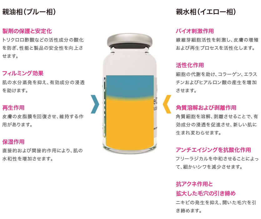 ミラノリピールは、トリクロロ酢酸(TCA)が35%配合されています。トリクロロ酢酸は濃度の違いにより肌への浸透度が変わります。