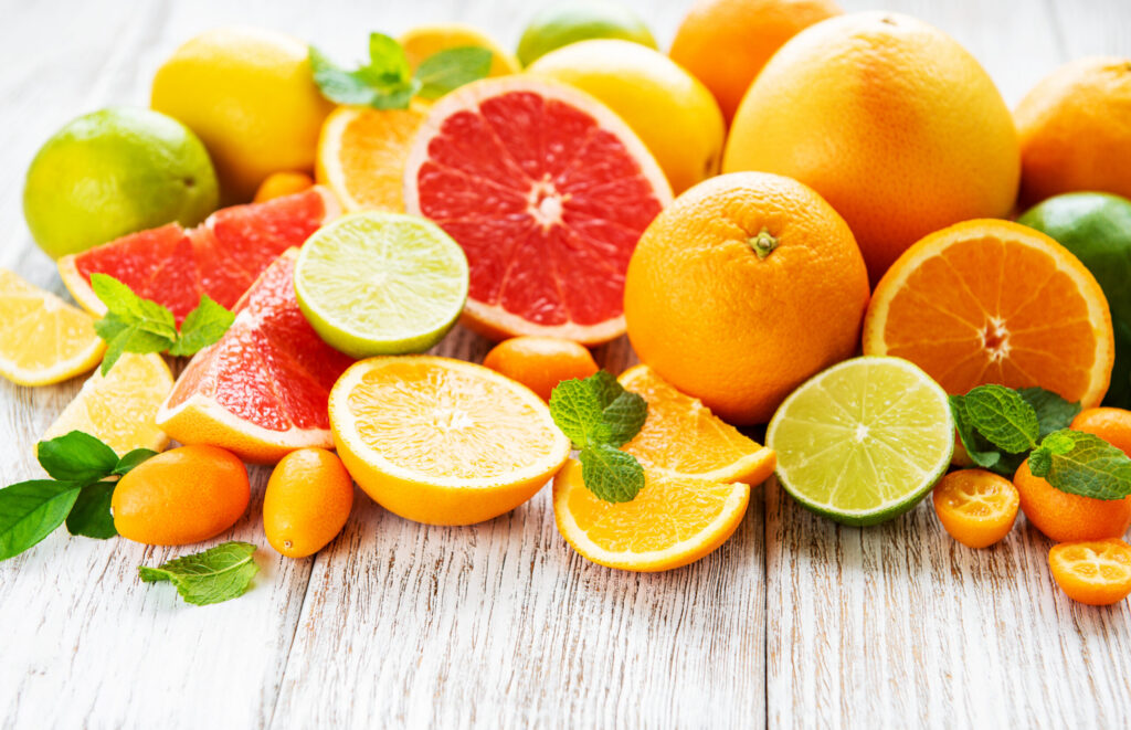 レモン、オレンジ、グレープフルーツ、トマト、ピーマンなどの果物や野菜に含まれています。ビタミンCは水溶性ビタミンであり、体の中に貯蔵されず摂取したものはすぐに利用されるため、毎日適量を摂ることが重要です。