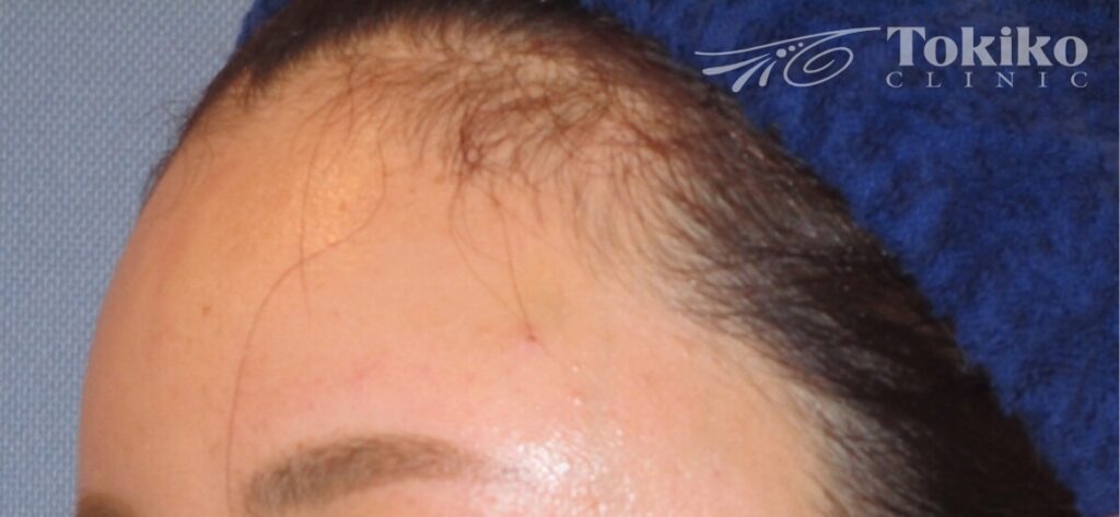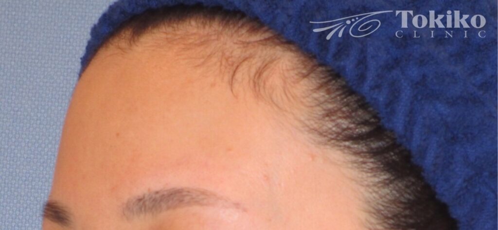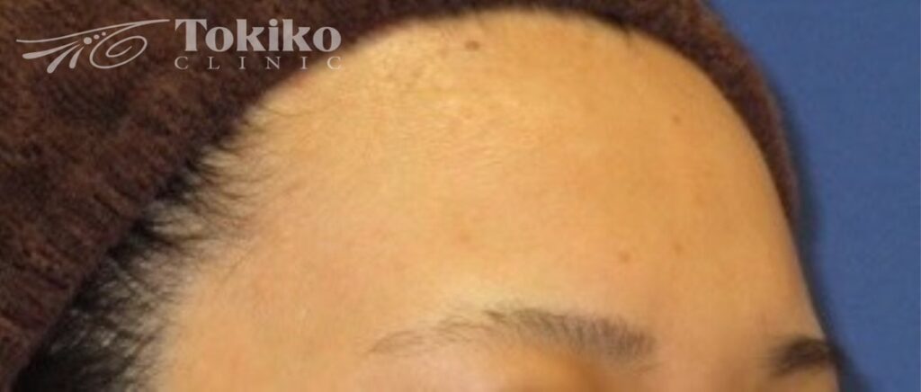 凹凸のない丸いつるんとした額はキレイで、若々しい印象を与えます。額のしわが気になるけど、瞼のたるみがありボトックス治療が困難な場合も、ヒアルロン酸注入によりしわを目立たなくすることができます。額のヒアルロン酸は吸収されにくく、持続は長いこともメリットです。お好みの形にもよりますが、2~3mlは必要です。今回は控えめに、数回に分けて注入希望でしたので1.5ml使用しました。