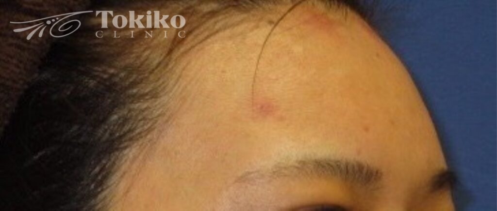 リスク:凹凸、血流障害による皮膚障害、感染 ダウンタイム:稀に内出血、腫れ、紅斑(個人差あり)、眉付近の圧迫感(数時間で解消)