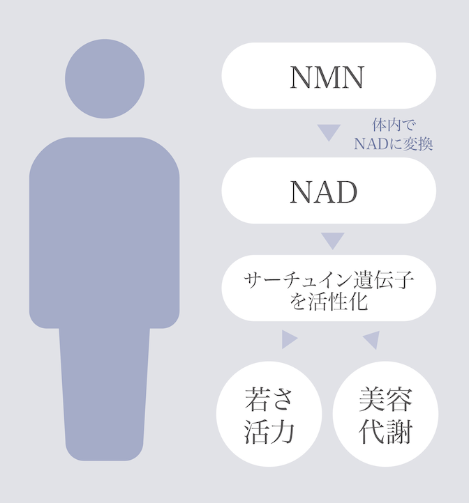 NAD+はミトコンドリアでエネルギー(ATP)を作るのに必須の補酵素であると同時に、老化や寿命を制御するサーチュイン遺伝を活性化すると言われており、加齢とともに体内でのNAD+量も急速に低下して、老化を引き起こしていると言われています。体内のNAD+量が上昇することで、老化を遅らせ、若々しく健康的な身体を保つことが期待されます。