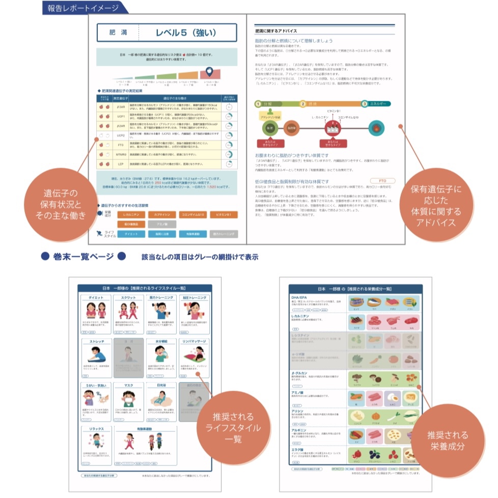 その上で、保有遺伝子に応じておすすめの栄養成分やライフスタイルを提示します。例えば、肥満の項目では、脂肪を分解しやすいのか、燃焼しやすいのかなど、遺伝子レベルで体質を判定し、アドバイスを細かく提示いたします。
