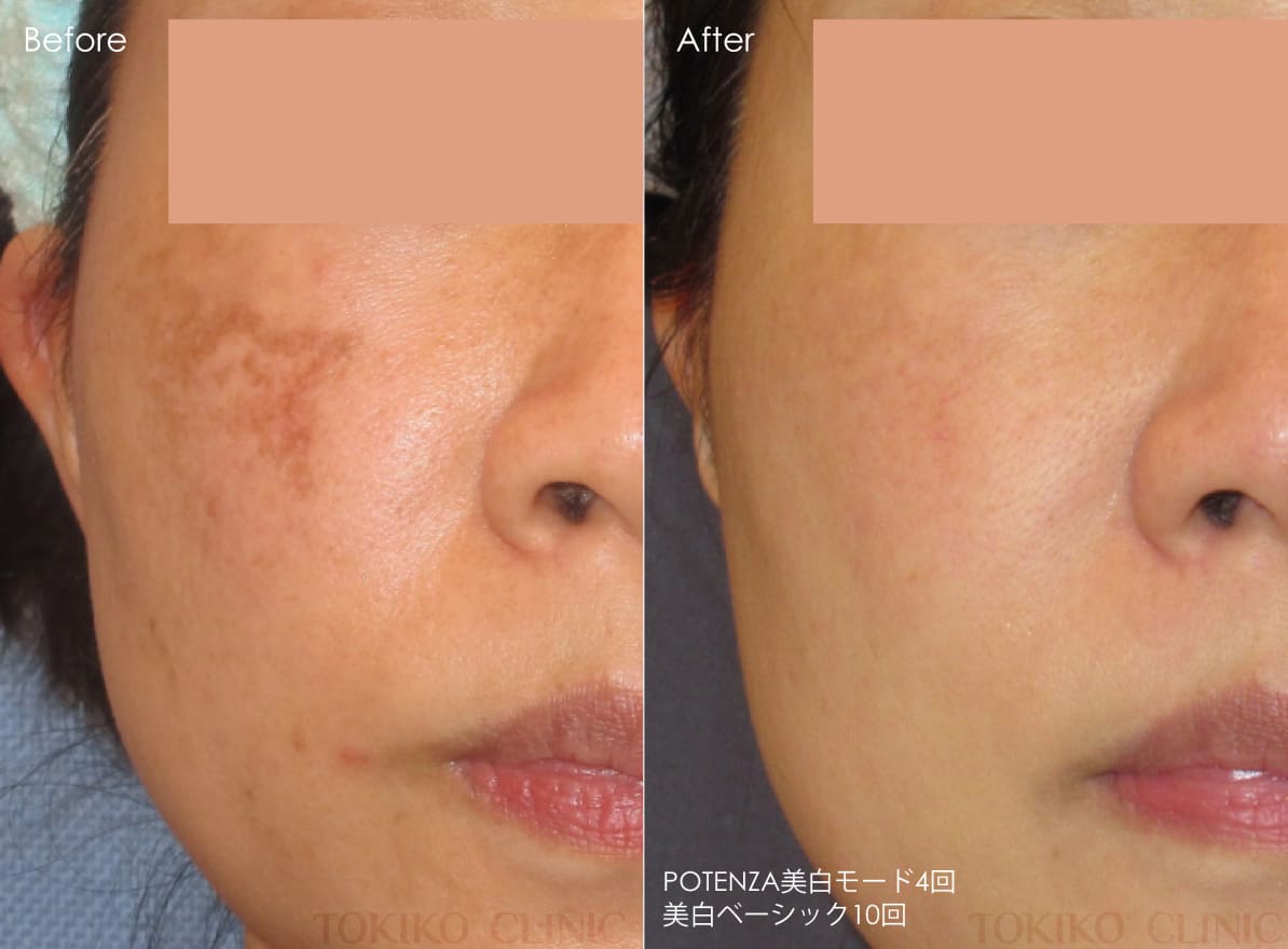 従来のニードルRF治療は痛みが強く、赤みなどのダウンタイムが長いものがほとんどでした。POTENZAは痛みが少なく、肝斑モードでは麻酔がなくても治療ができます。