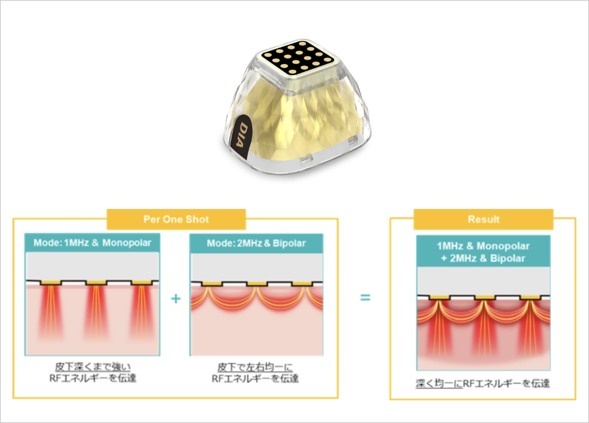 ダイヤモンドチップは、1ショットでモノポーラとバイポーラが照射される独自の照射方式が採用されています。モノポーラ真皮深層まで熱を入れて引き締め、同時にバイポーラで表皮から真皮浅層に熱を加えて肌表面の引き締めを行います。