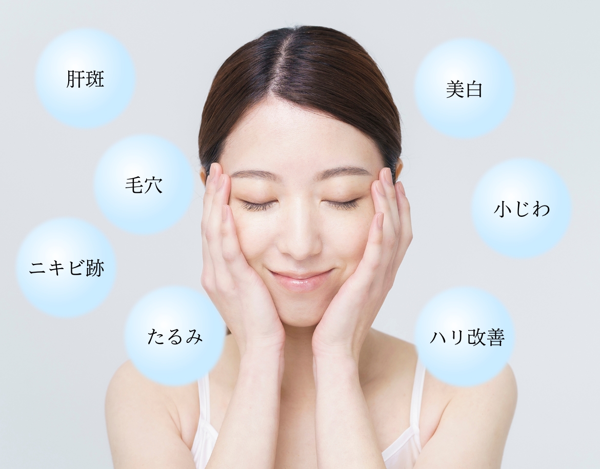 しわやたるみ、毛穴の開き、ニキビ跡の改善、美白、保湿などさまざまな美肌効果が見込めます。
