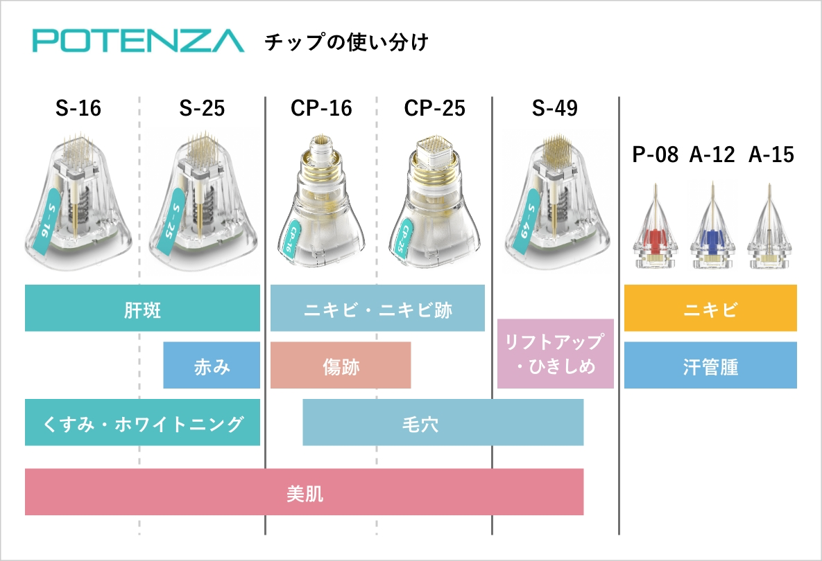 極細のニードルを搭載したPOTENZAのチップは、それぞれニードルの密度や長さが異なります。当院ではモードやお肌状態に合わせて適切なチップ・設定を使い分けています。