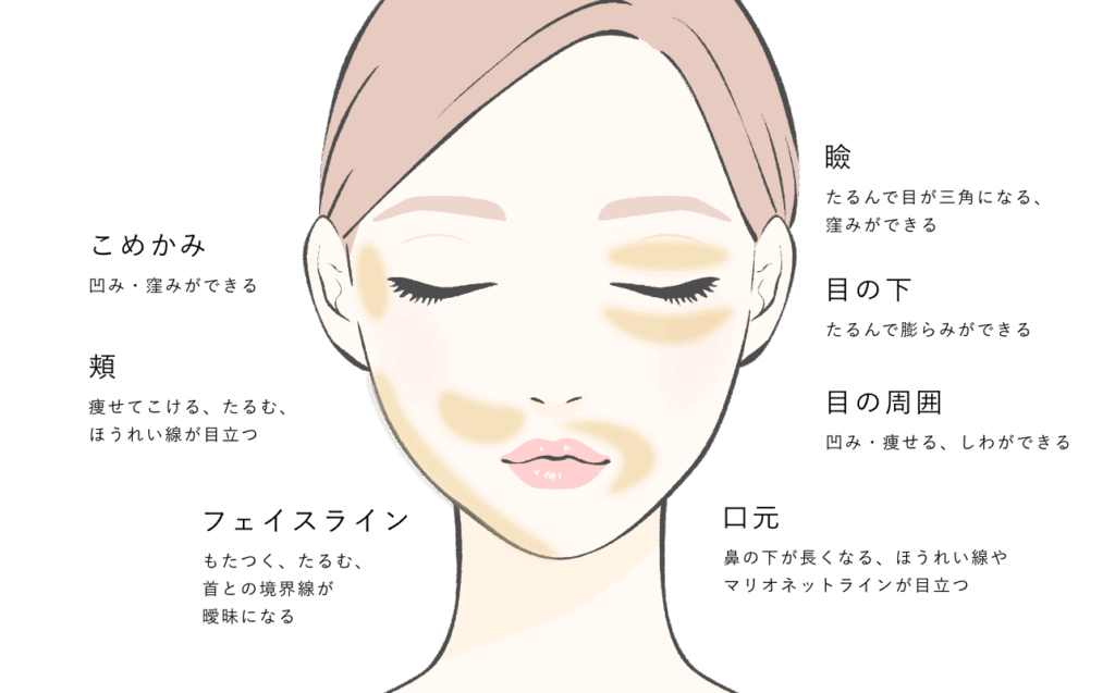 骨格や筋肉、皮下組織(脂肪など)が立体的に変化することでたるみが起こり、輪郭まで変化させてしまいます。